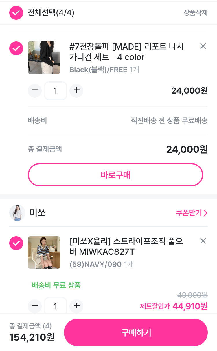 - 지그재그에서 결제하고자 하는 상품을 모아 한번에 결제 가능