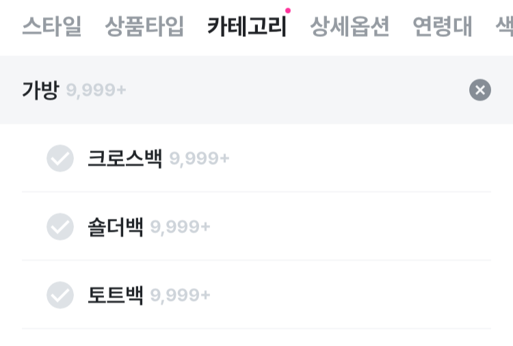 - ex) "크로스백"이라는 검색어를 입력할 경우, 카테고리는 가방, 상의,패션잡화,비치웨어 등이 나타나며 패션잡화를 선택할 경우 핸드폰 가방, 핸드폰 목걸이 등의 상품들이 검색됨.